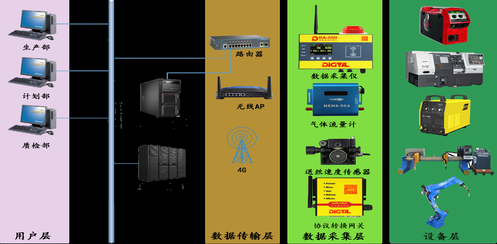 焊接数据采集控制系统,主要是对焊接数据监测、记录、分析,并参与到生产管理流程,达到提高生产效率、保证生产质量的目的。